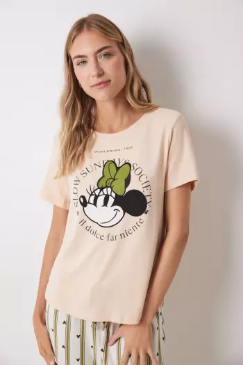 Пижама с короткими рукавами и длинными брюками из сверхмягкого трикотажа, приятная на ощупь. Идеально подходит для любителей мультфильмов. Верх с принтом Minnie спереди, круглая горловина и спущенные рукава. Брюки с полосатым принтом и деталями логотипа Minnie. Эластичный пояс, регулируемый шнурком. Основная ткань содержит не менее 50% переработанных полиэфирных волокон.